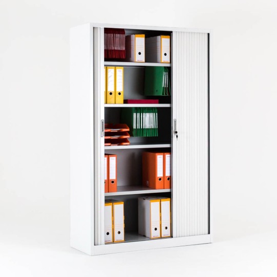L'armoire haute à rideaux FLAP en métal est idéale pour les espaces de bureau afin de ranger et stocker des classeurs, dossiers suspendus ou autres documents.